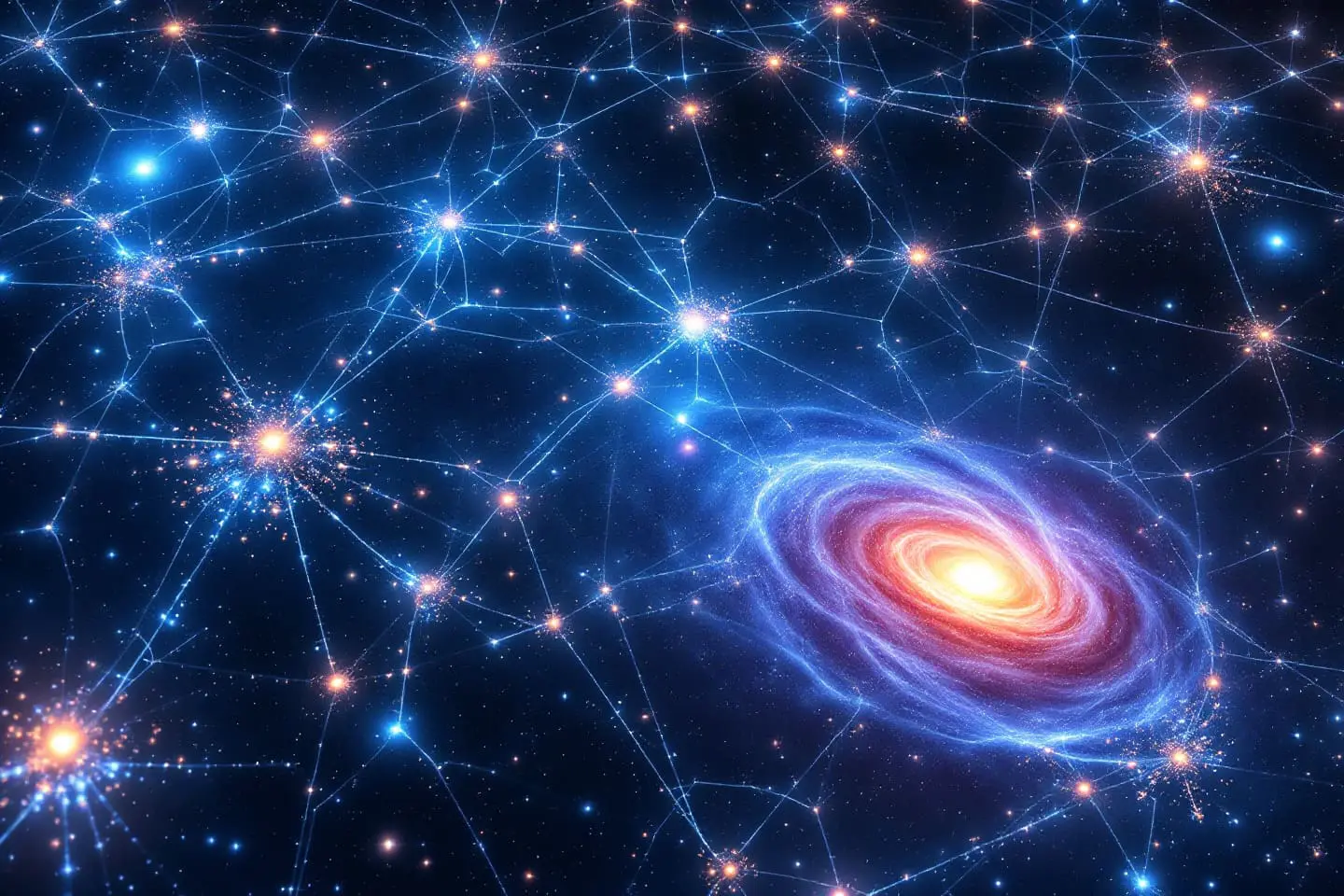 An image showing how cosmology explains our origin by visualizing the vast cosmic web and tracing a filament down to a single galaxy and star system